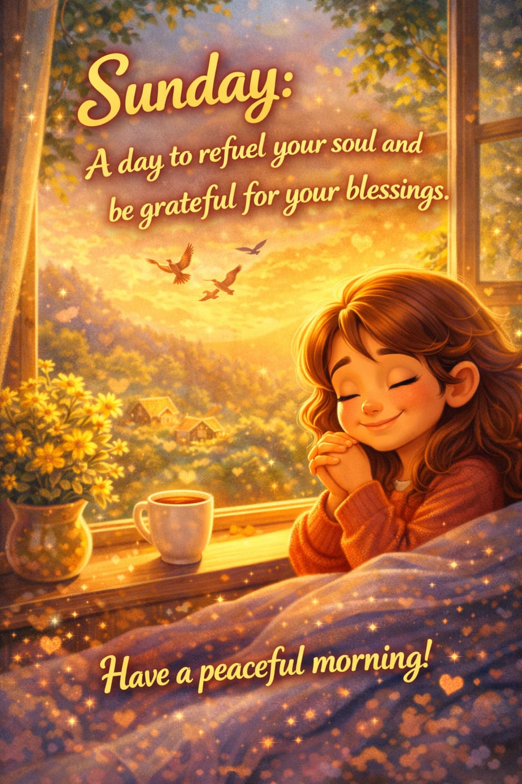 - “Soft light, warm coffee, and a grateful heart. Wishing you the most soulful Sunday imaginable.”