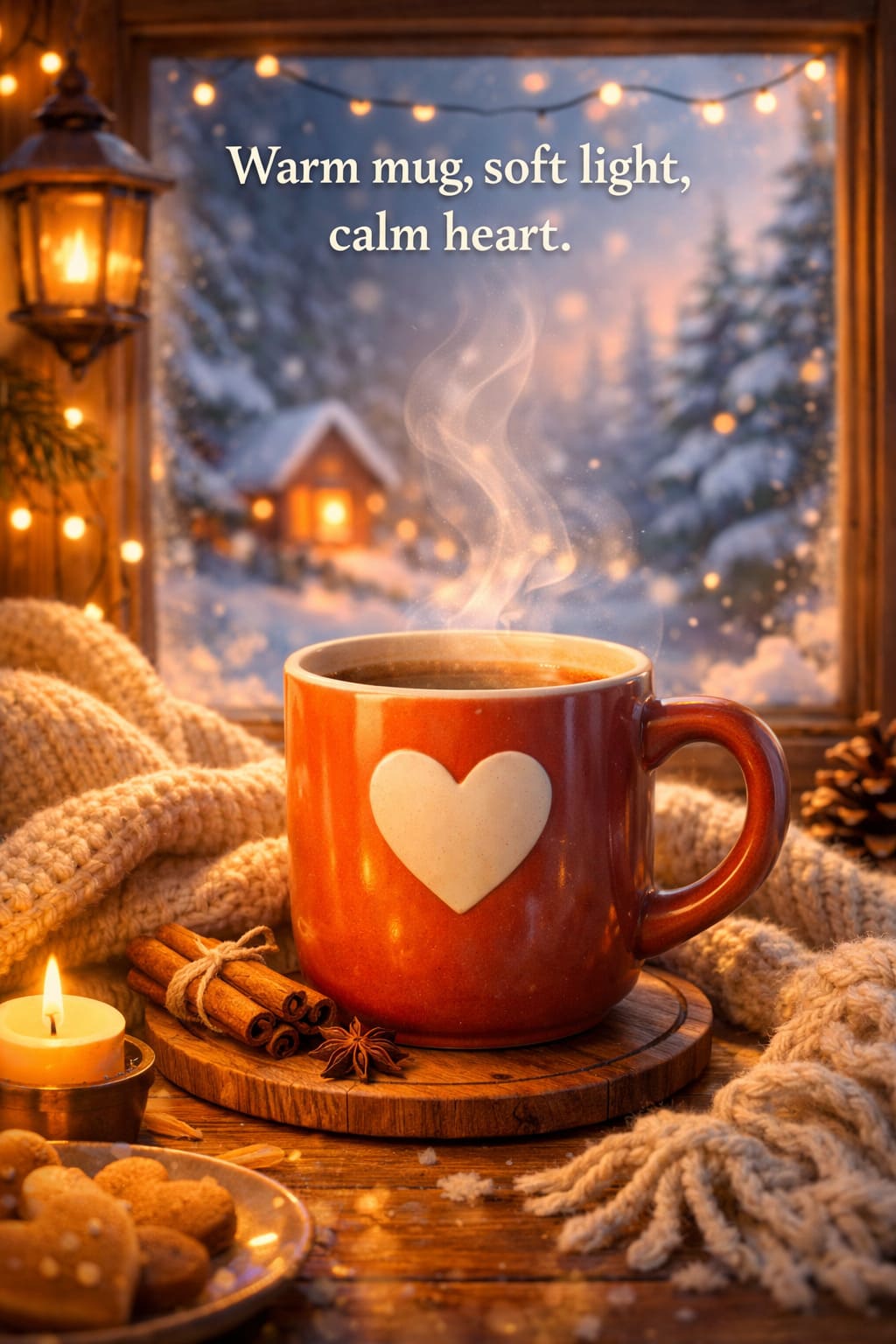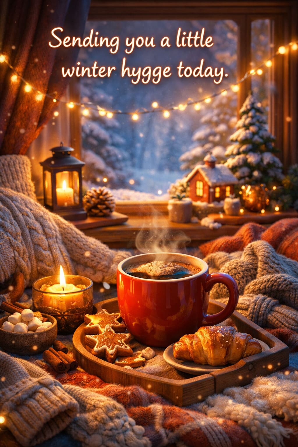 Winter can feel heavy, but cozy visuals balance that weight. A simple coffee postcard can say: