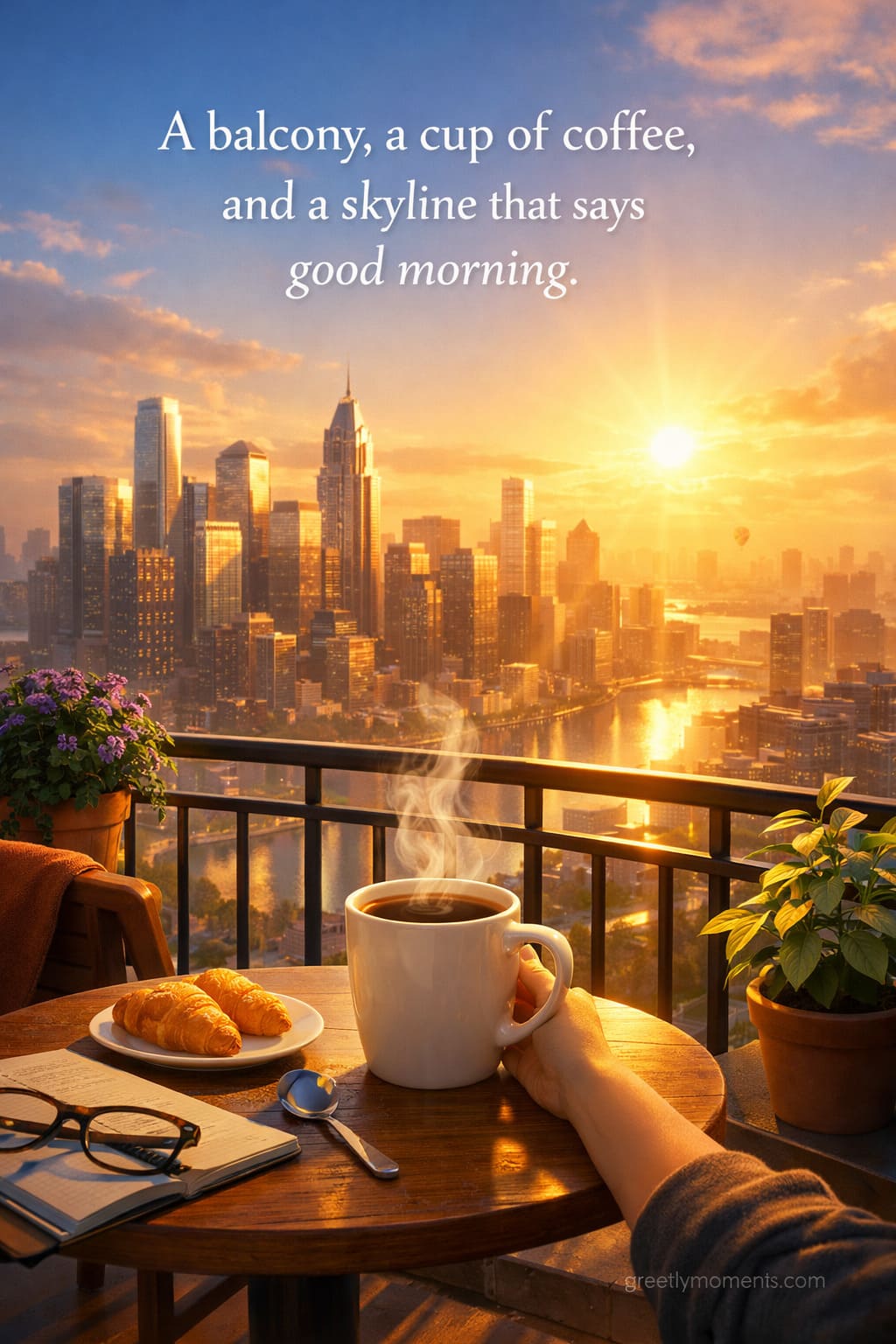 2. “A balcony, a cup of coffee, and a skyline that says good morning.”