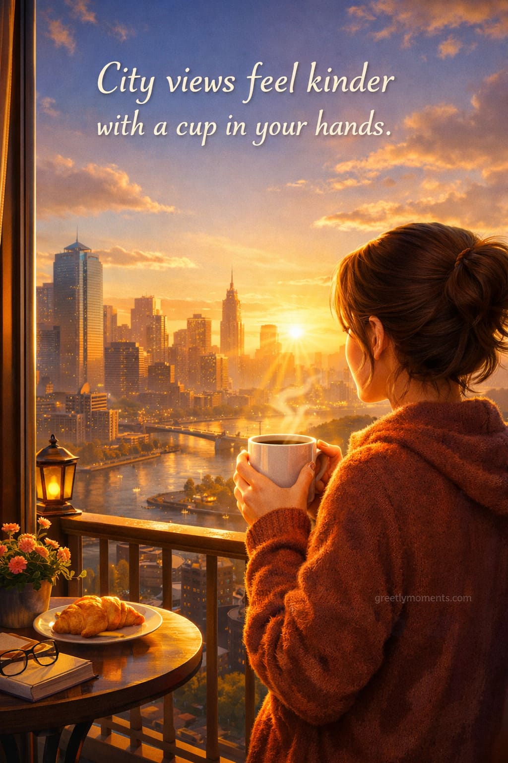 Before notifications, before plans, before the rush — it’s just you, a warm cup, and the city slowly waking up below. As someone who genuinely loves postcards and greeting cards, I’ve noticed that this moment appears again and again in the most beloved designs: soft light, rooftops, windows, steam rising from a cup, and that feeling of “today can be good.”