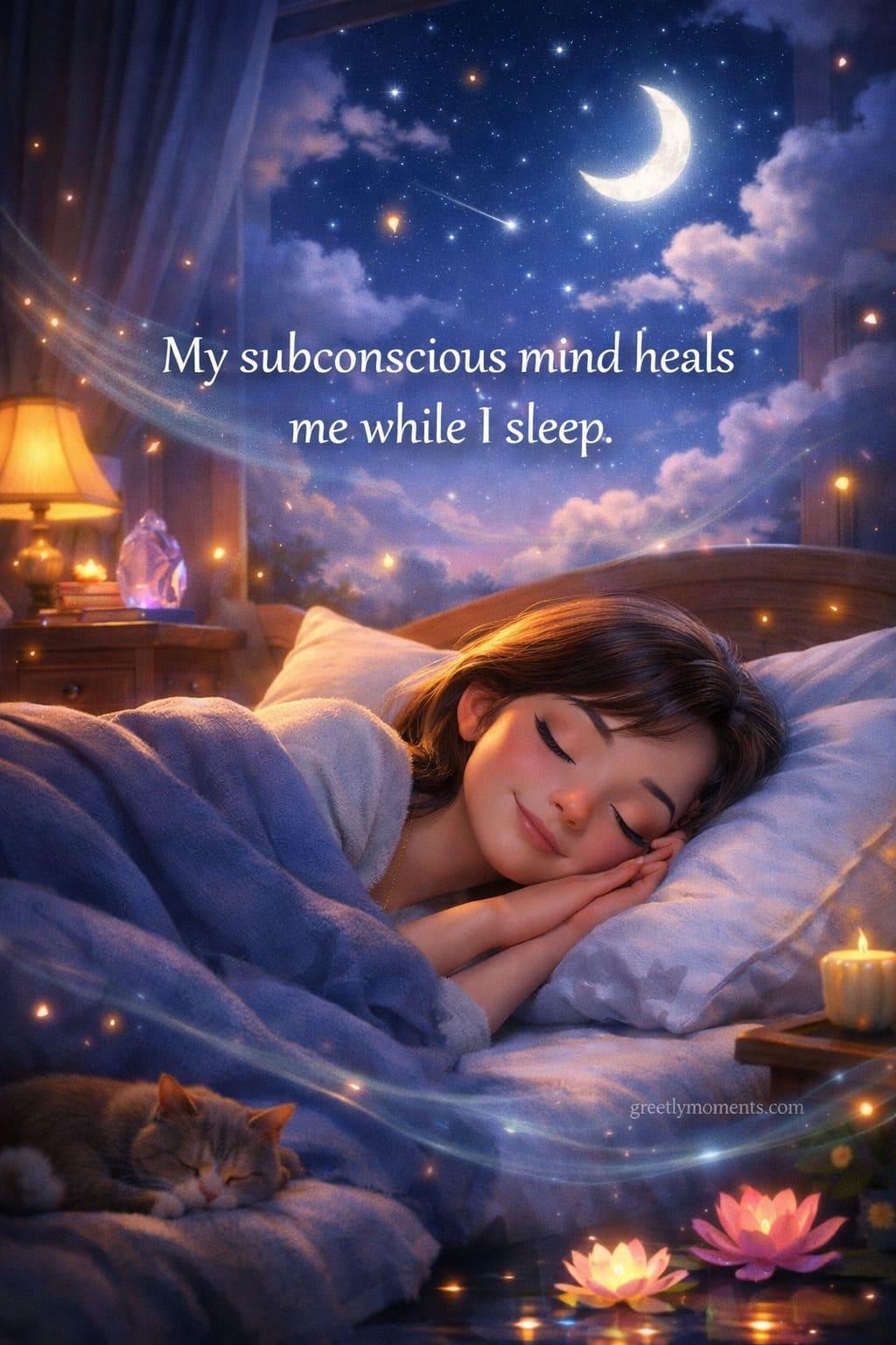During deep sleep, the subconscious mind releases stored tension, emotional fatigue, and old mental noise. Affirmations gently guide this process, replacing stress with calm, fear with trust, and exhaustion with quiet strength.