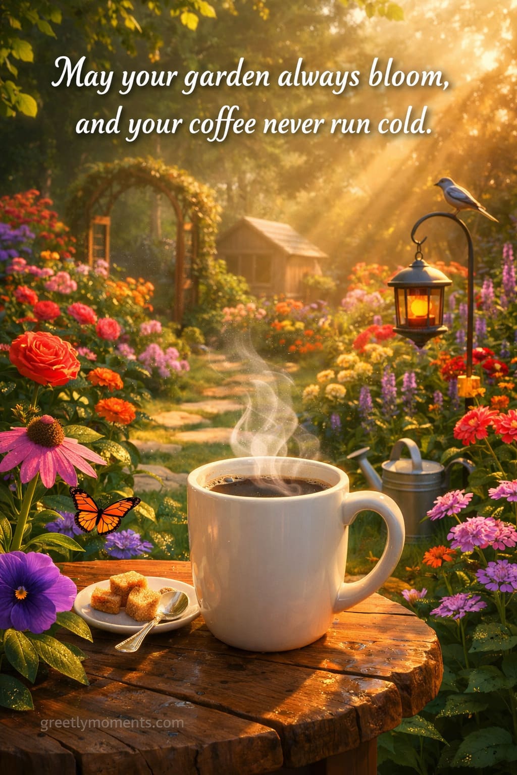 - “May your morning coffee be as warm as the sun on your garden’s petals.”