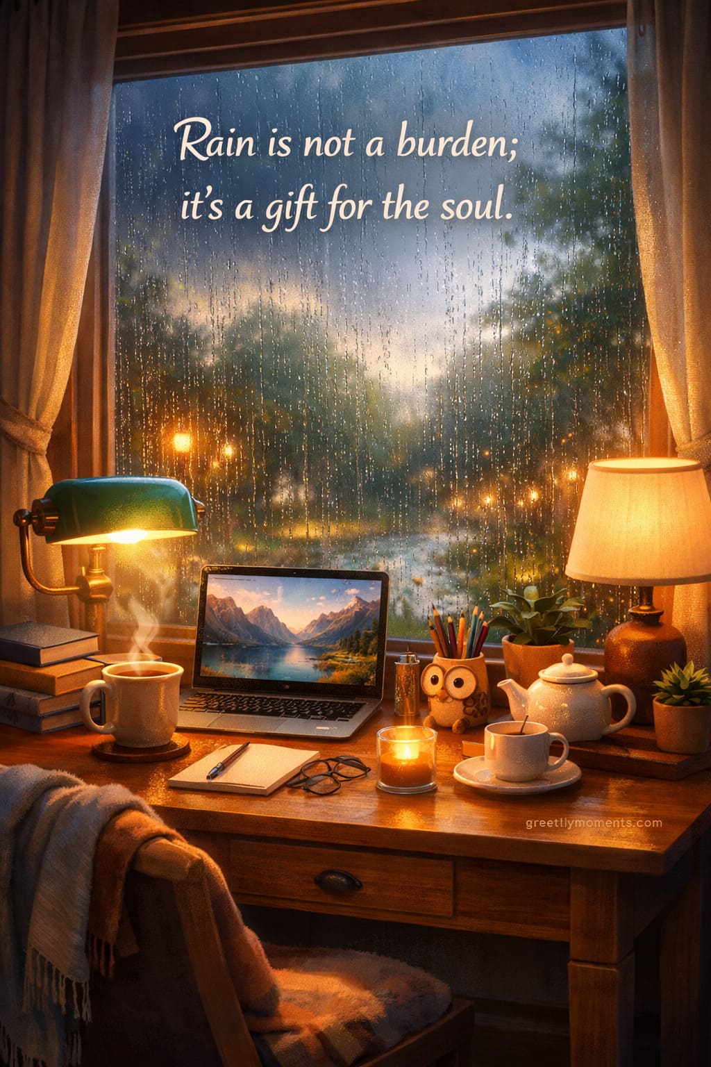 Here are some lovely greetings and thoughtful wishes that pair perfectly with a rainy home office setting: