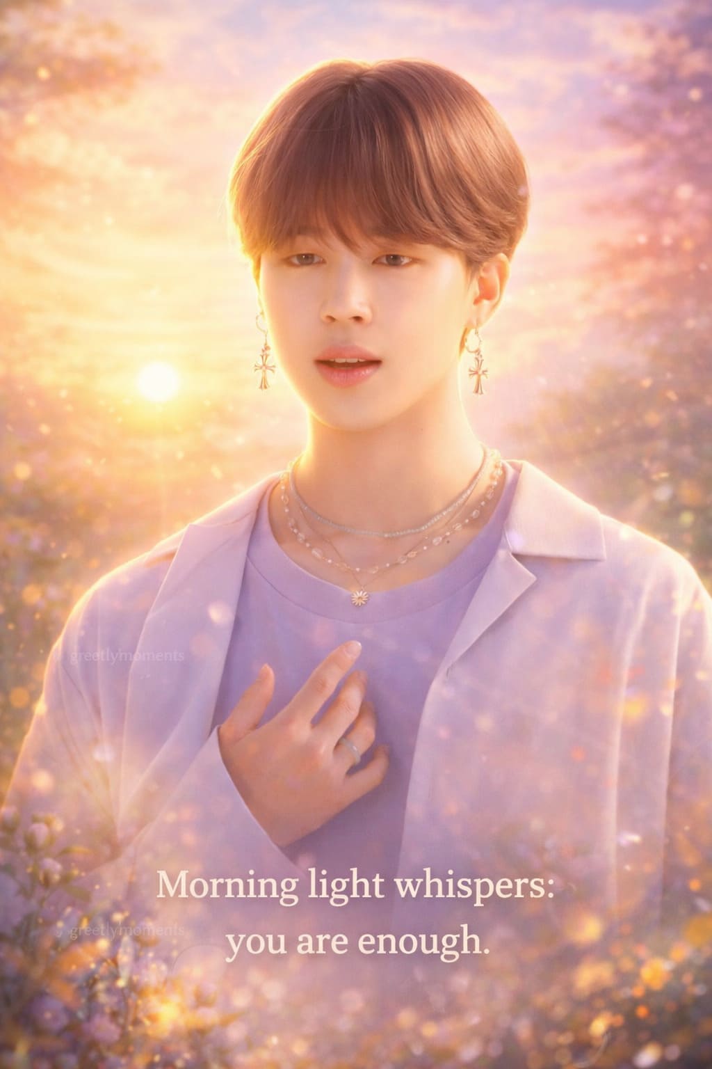 Jimin embodies softness, elegance, and emotional warmth. That’s why his aesthetic fits perfectly with sunrise themes, pastel colors, and peaceful greetings. Fans often use these quotes on: