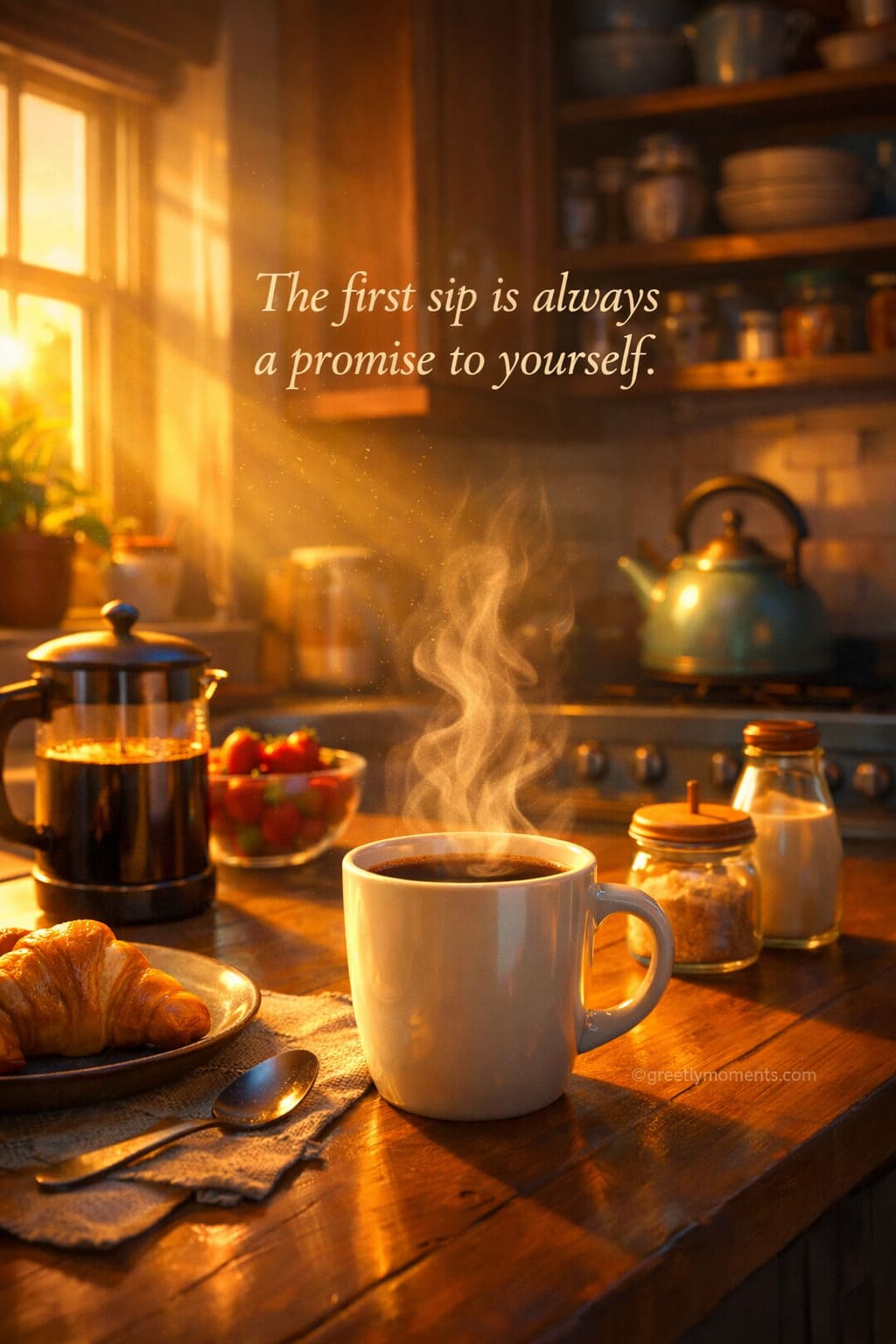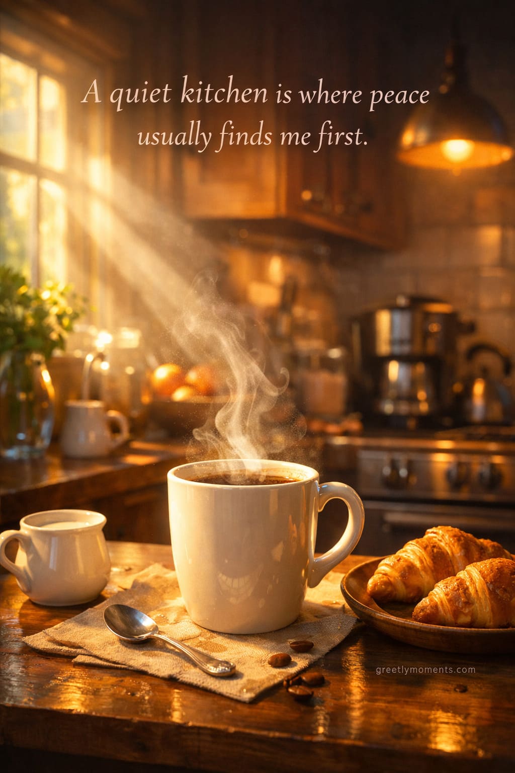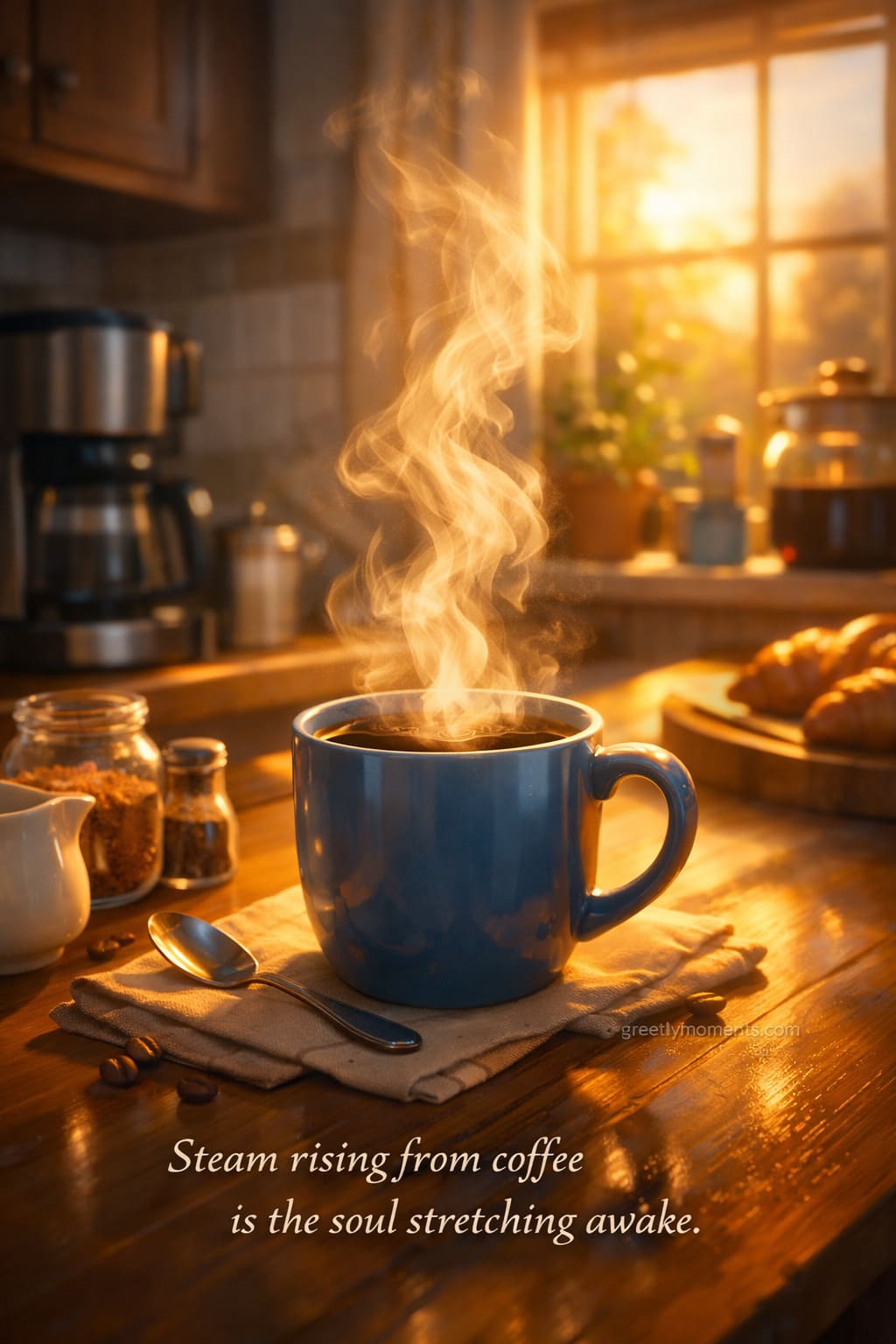 This theme combines high-interest visuals (early morning light, kitchen, coffee steam) with universal feelings: calm, routine, comfort. It resonates strongly in greeting cards, lifestyle blogs, Pinterest collections, and quote compilations because it connects visuals with emotion — not noise.