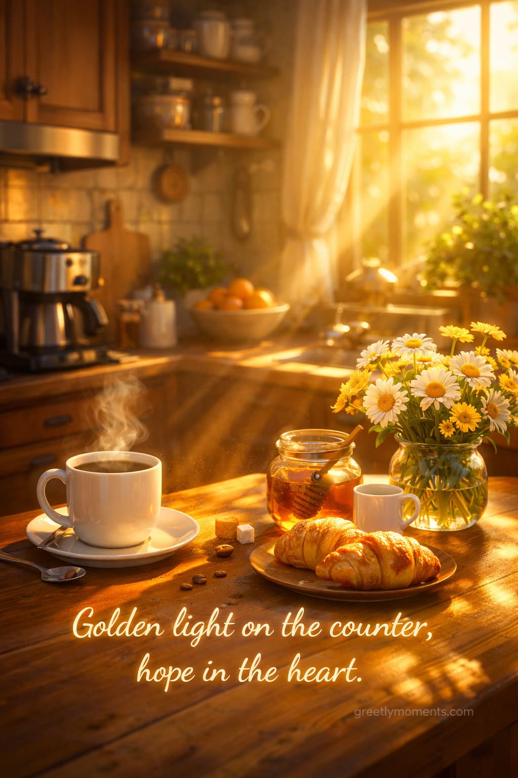 There is something magical about a sun-drenched kitchen in the morning. The soft golden light slipping through the window, the quiet hum of a new day beginning, and that gentle curl of steam rising from a freshly poured cup of coffee — it feels like a small, private celebration of life.