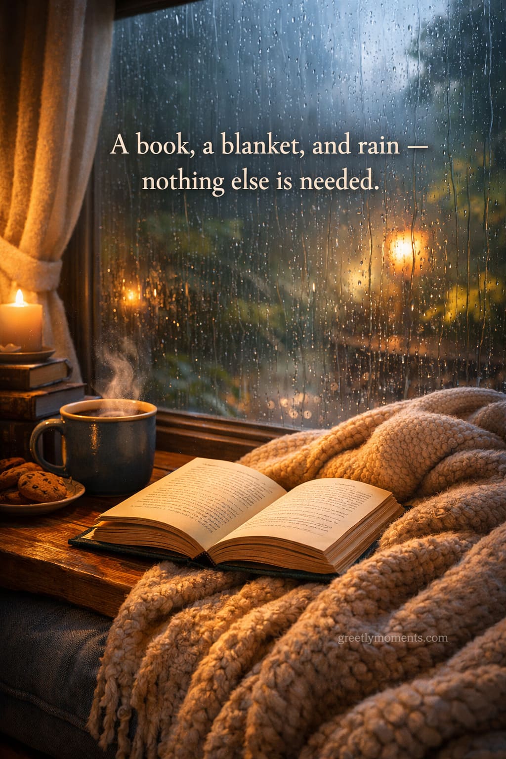 - “Rainy Saturdays are for unread chapters and warm drinks.”