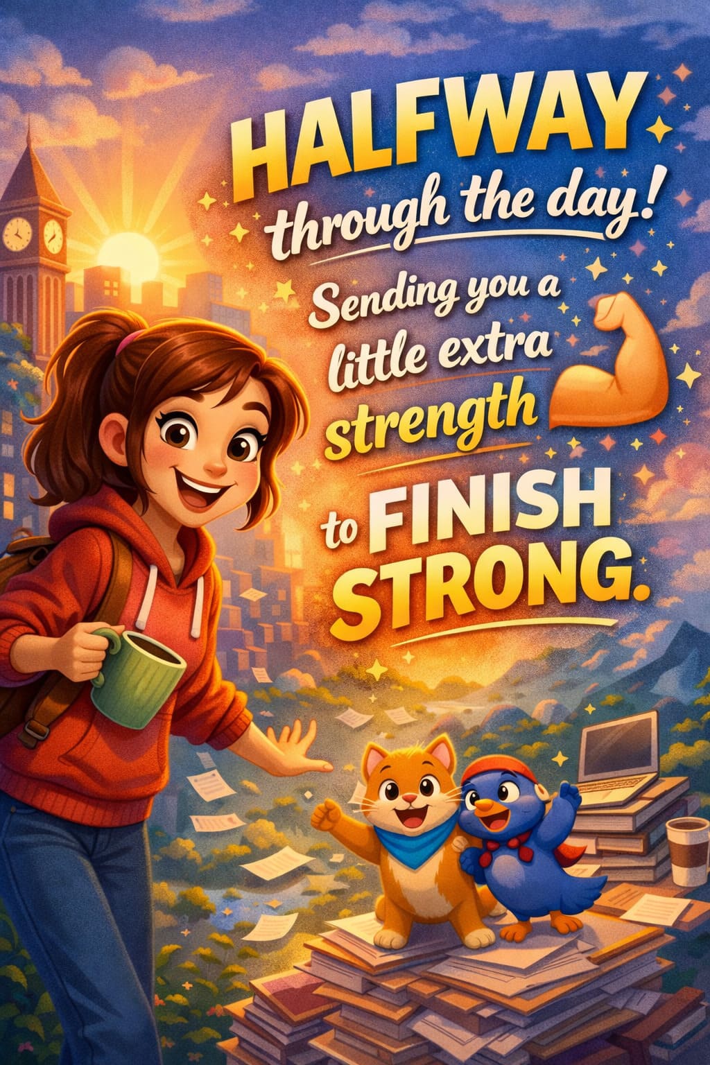 - “Halfway through the day! Sending you a little extra strength to finish strong.”