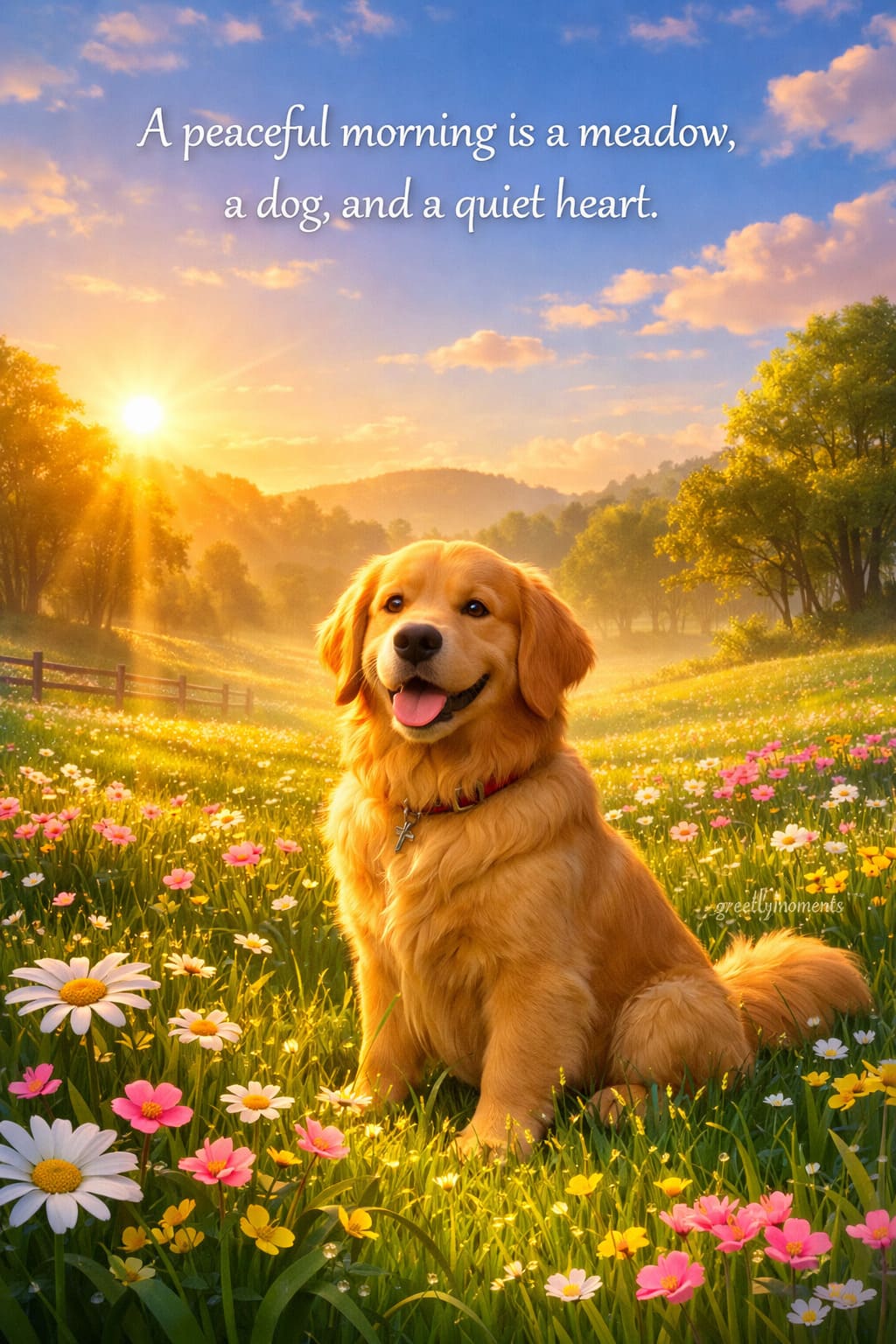 Golden Retrievers symbolize kindness, loyalty, and pure joy. When you pair that with a peaceful spring meadow, it creates a perfect theme for good morning wishes, inspirational quotes, and heartfelt greeting cards. These images remind us to slow down, breathe deeply, and appreciate the gentle beauty of a new day.
