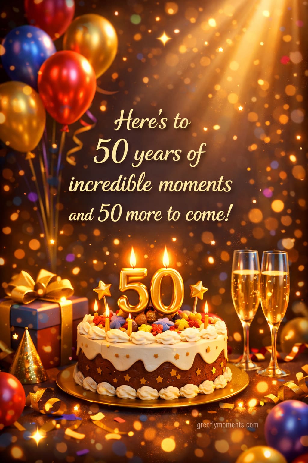- “Happy 50th birthday! It’s time to celebrate all the incredible moments that brought you to this point.”