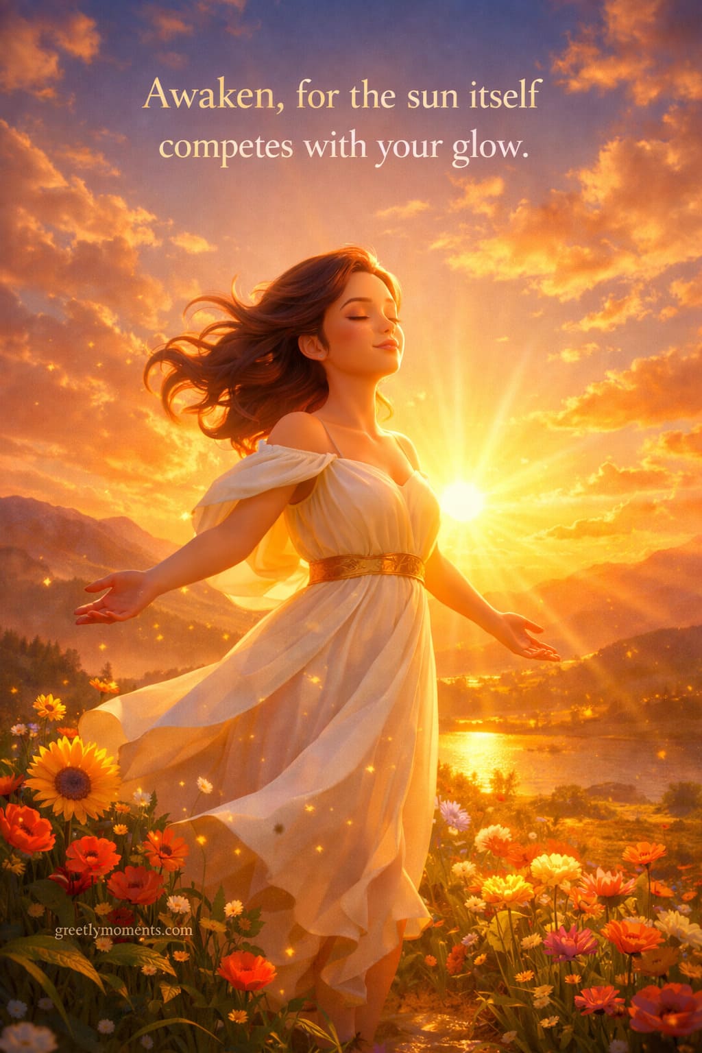 2. “Rise and shine, radiant soul. The world awaits your brilliance with the same anticipation as the season’s grandest ball.”