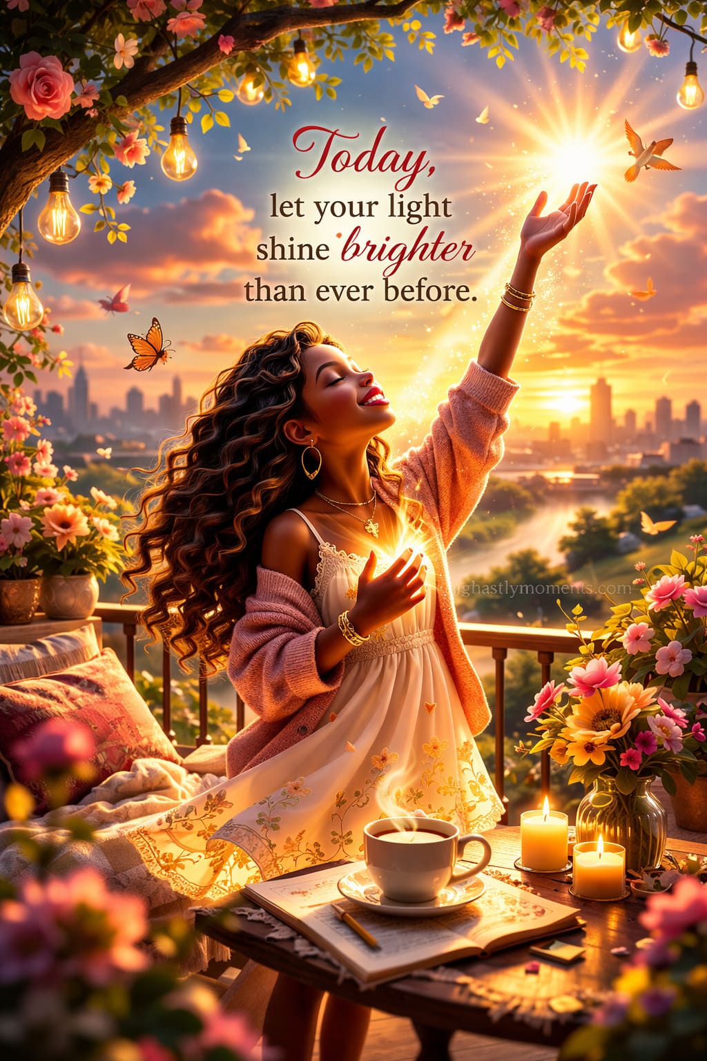 • “Good morning, beautiful! Today is another chance to shine brightly and show the world how amazing you are!”